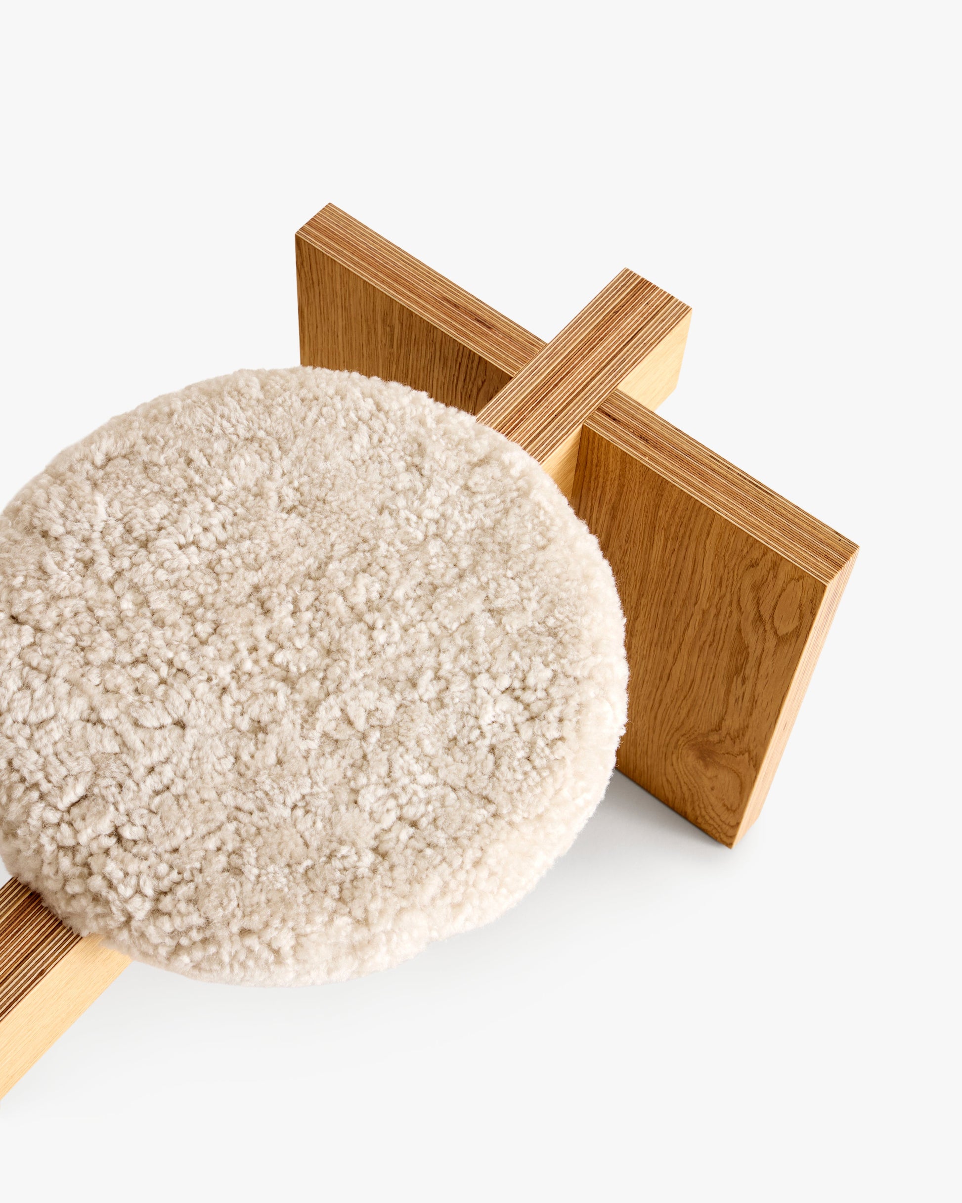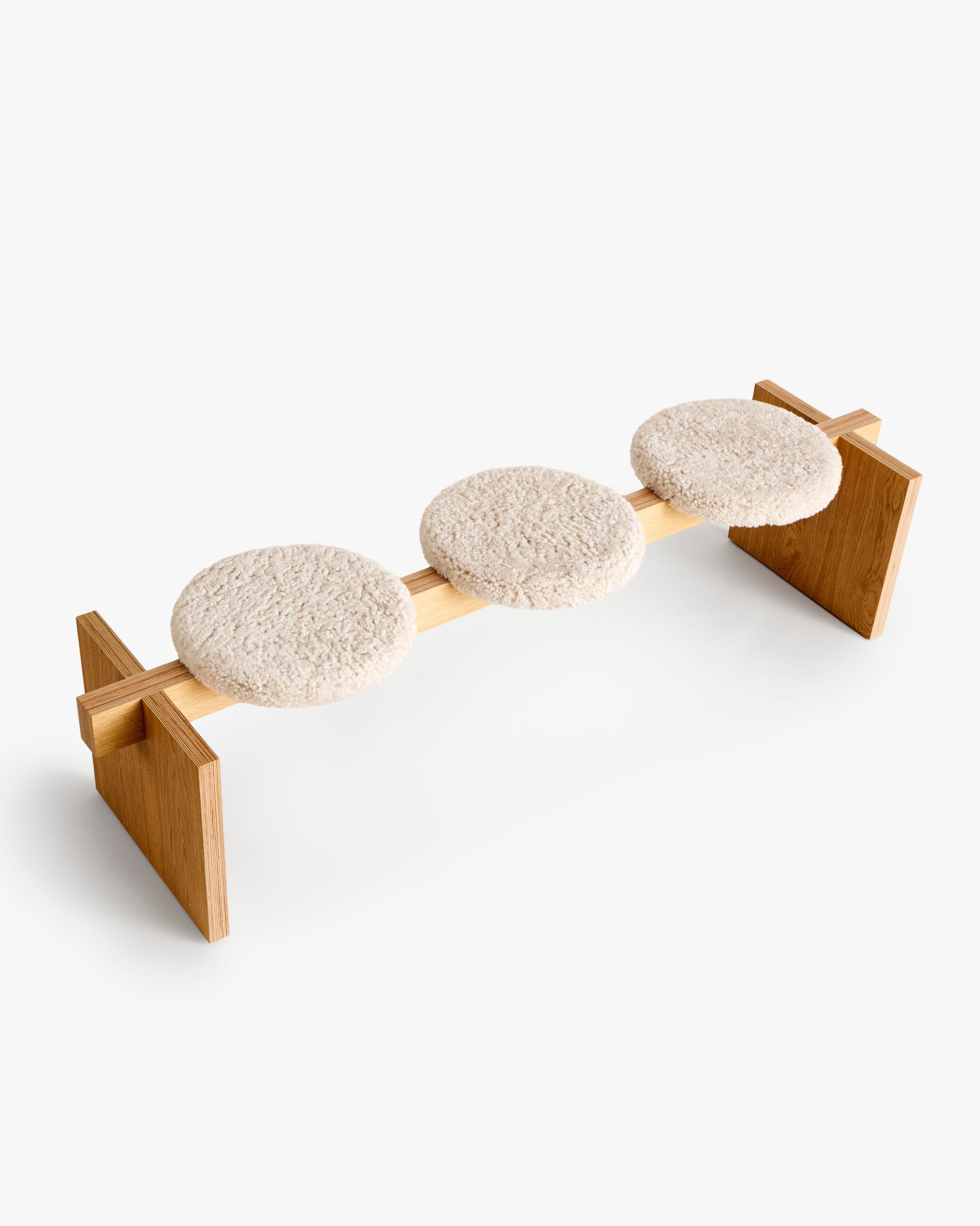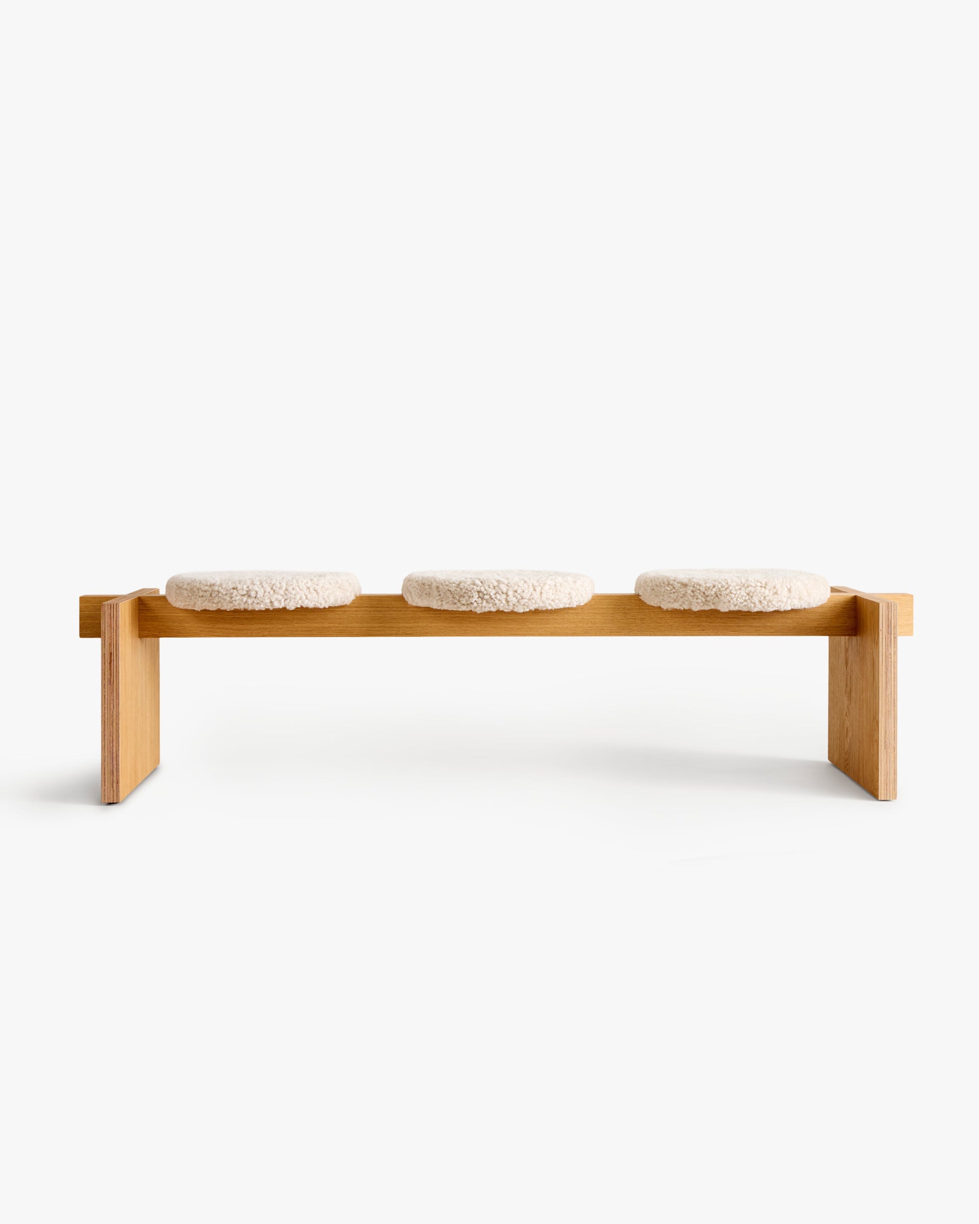 Ⓓ Lavvo Golbma er en massiv benk i eik kryssfiner med bjerk kjerne. Setene er laget av eksklusivt saueskinn fra Skandilock i fargen Moonlight. Møbelet fås i både oljet og hvitoljet utførelse.